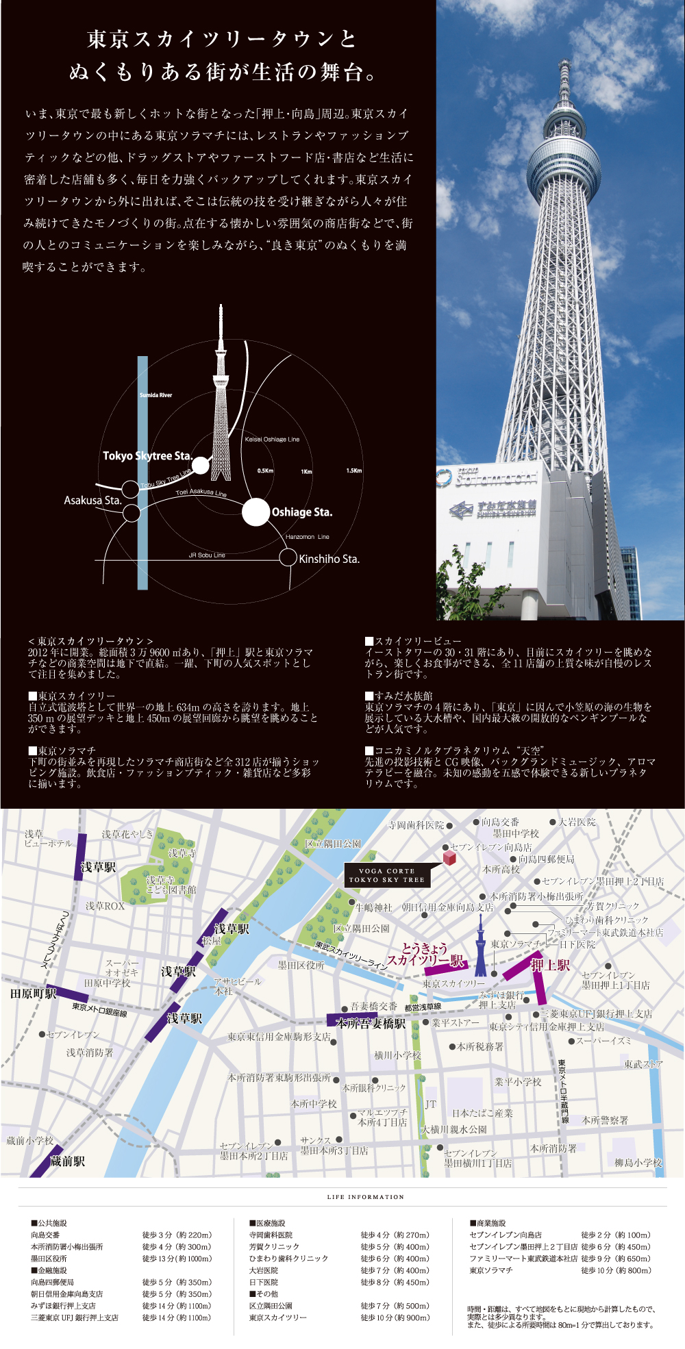 | ■交通 | 東京メトロ半蔵門線・都営浅草線 「押上」駅徒歩8分 東武スカイツリーライン 「とうきょうスカイツリー」駅徒歩8分 |